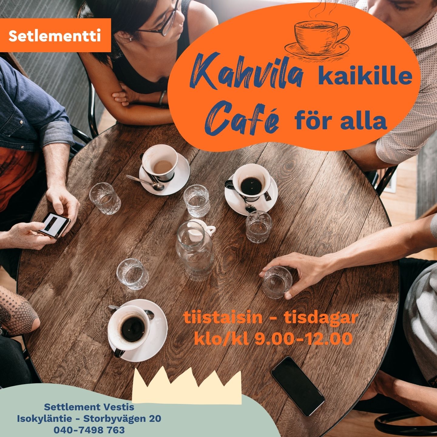 Tervetuloa Setlementtikahvilaan, Huvilakatu 1:een! Kahvila on auki tiistaisin ja torstaisin kello 12-14. Tiistaisin kahvilassa on mahdollisuus nauttia kevyt lounas, kun Maarit keittää kattilallisen keittoa. Yhteisöllisessä kahvilassamme voit rupatella muiden kanssa ja lukea sanoma- ja aikakauslehtiä. Tutustu myös kirjastonurkkaukseemme! Huom. torstaina 2.4. kahvila on kiinni.