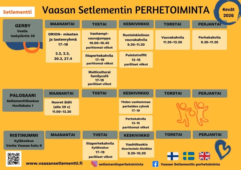 Vaasan Setlementillä on lapsiperheille tarkoitettua toimintaa Gerbyssä, Palosaarella ja Ristinummella.