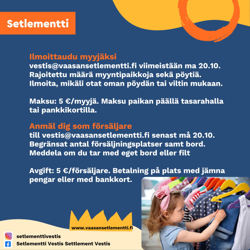Jos haluat tulla myymään tavaroita, ilmoittaudu mukaan viimeistään 20.10. vestis@vaasansetlementti.fi. Myyntipaikkoja on rajoitetusti. Myyntipaikan hinta on 5 euroa/myyjä.