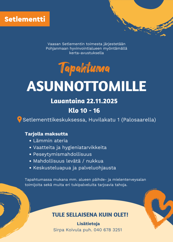 Vaasan Setlementti järjestää Pohjanmaan hyvinvointialueen myöntämällä kerta-avustuksella lauantaina 22.11.2025 kello 10-16 asunnottomille tarkoitetun tapahtuman Palosaarella, Setlementtikeskuksessa, Huvilakatu 1:ssä.