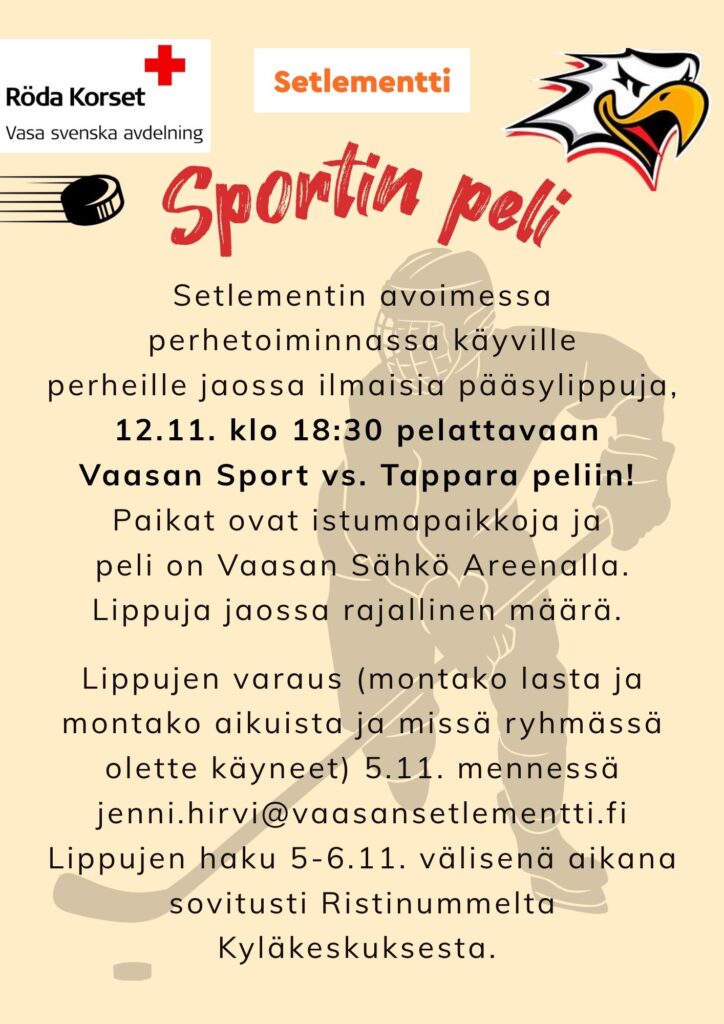 Jaamme ilmaiseksi lippuja Setlementin avoimen perhetoiminnan ryhmissä käyville perheille lippuja 12.11. kello 18:30 pelattavaan Vaasan Sport – Tappara -peliin.