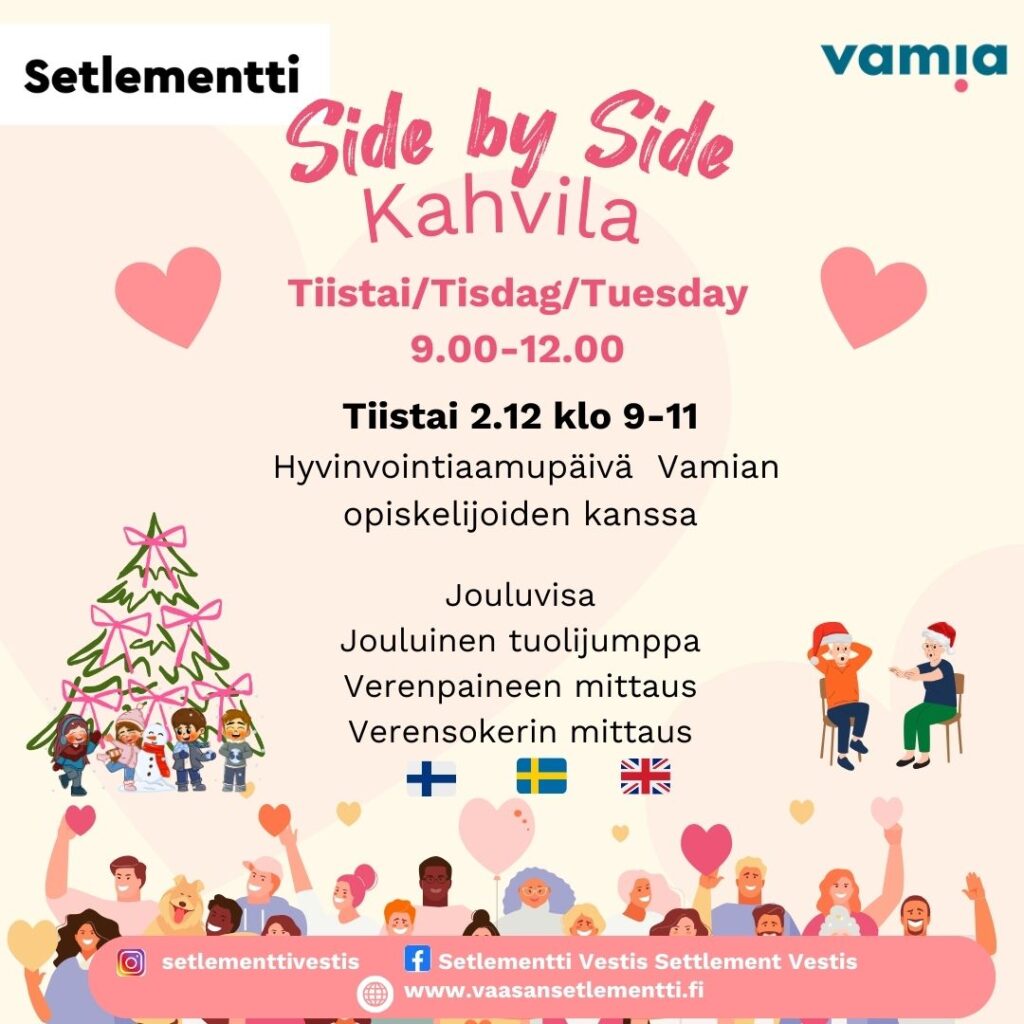 Tiistaina 2.12. kello 9-11 Vamian opiskelijat tulevat Gerbyhyn, Vestiksen Side by Side -kahvilaan. Hyvinvointiaamupäivän ohjelmassa on kello 9-11 jouluista tuolijumppaa, verenpaineen ja verensokerin mittausta.
