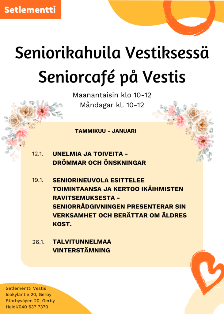 Vaasan Setlementin Gerbyn senioriryhmä kokoontuu Vestiksen Seniorikahvilassa, Isokyläntie 20, maaanantaisin kello 10-12. Tervetuloa mukaan kivaan porukkaan! Voit osallistua ryhmän toimintaan silloin kun sinulle sopii. Osallistuminen on ilmaista.
