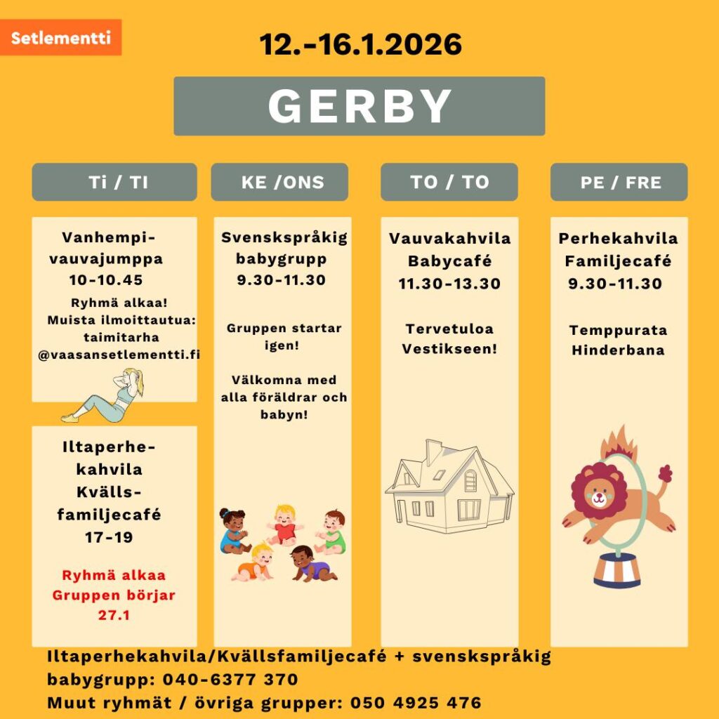 Vanhempi-vauvajumppa kello 10-10.45 Vestiksessä Gerbyssä parittomilla viikoilla. Jumppaan ilmoittaudutaan joka kerta erikseen: taimitarha@vaasansetlementti.fi.