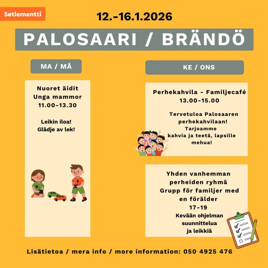 Perhekahvila kello 13-15 Setlementtikeskuksessa Palosaarella parittomilla viikoilla.
