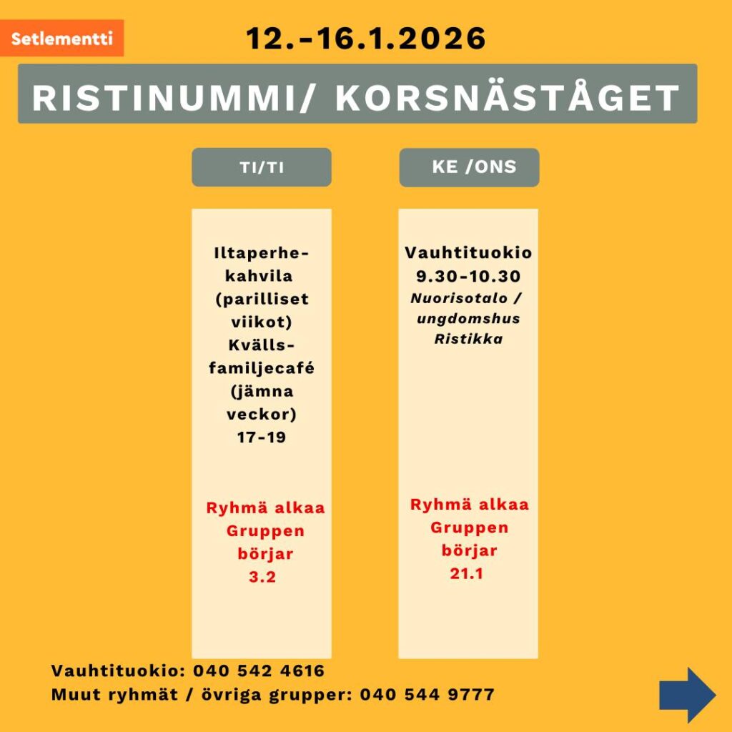 Iltaperhekahvila Kyläkeskuksessa Ristinummella kello 17-19 parillisilla viikoilla. Ryhmä alkaa 3.2.