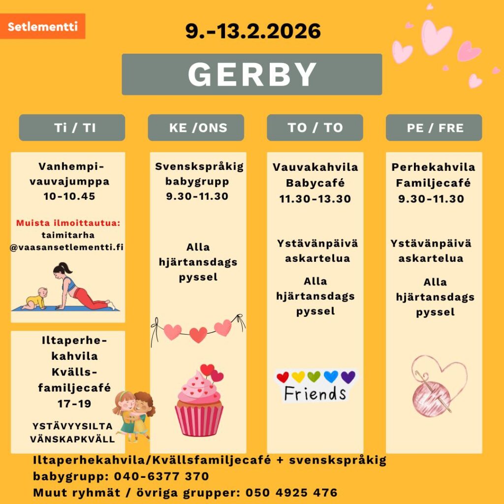 Vanhempi-vauvajumppa kello 10-10.45 Vestiksessä Gerbyssä parittomilla viikoilla. Jumppaan ilmoittaudutaan joka kerta erikseen: taimitarha@vaasansetlementti.fi.