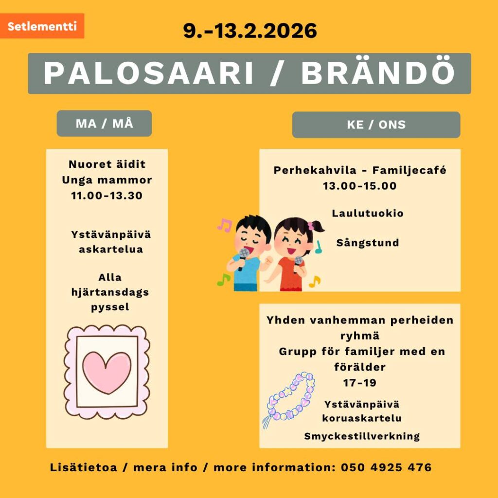 Perhekahvila kello 13-15 Setlementtikeskuksessa Palosaarella parittomilla viikoilla.