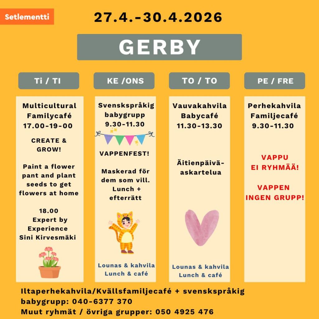 Iltaperhekahvila kello 17-19 Vestiksessä Gerbyssä parittomilla viikoilla.
