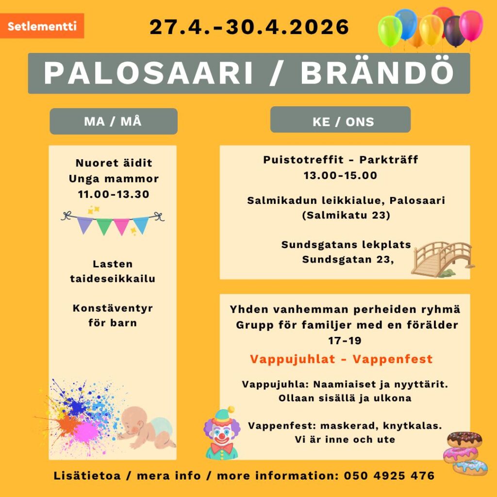 Perhekahvila kello 13-15 Setlementtikeskuksessa Palosaarella parittomilla viikoilla.