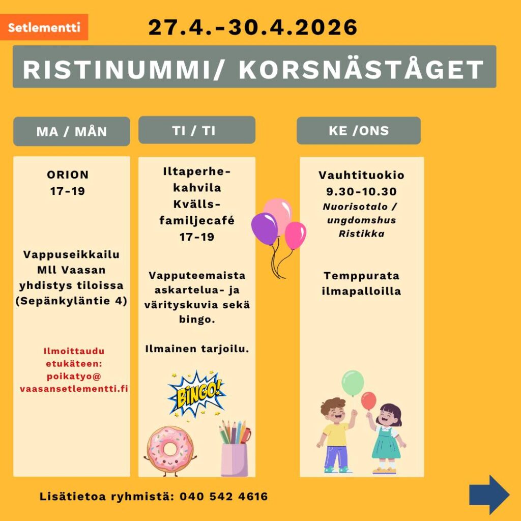 Vaasan Setlementillä on lapsiperheille tarkoitettua toimintaa Gerbyssä, Palosaarella ja Ristinummella.