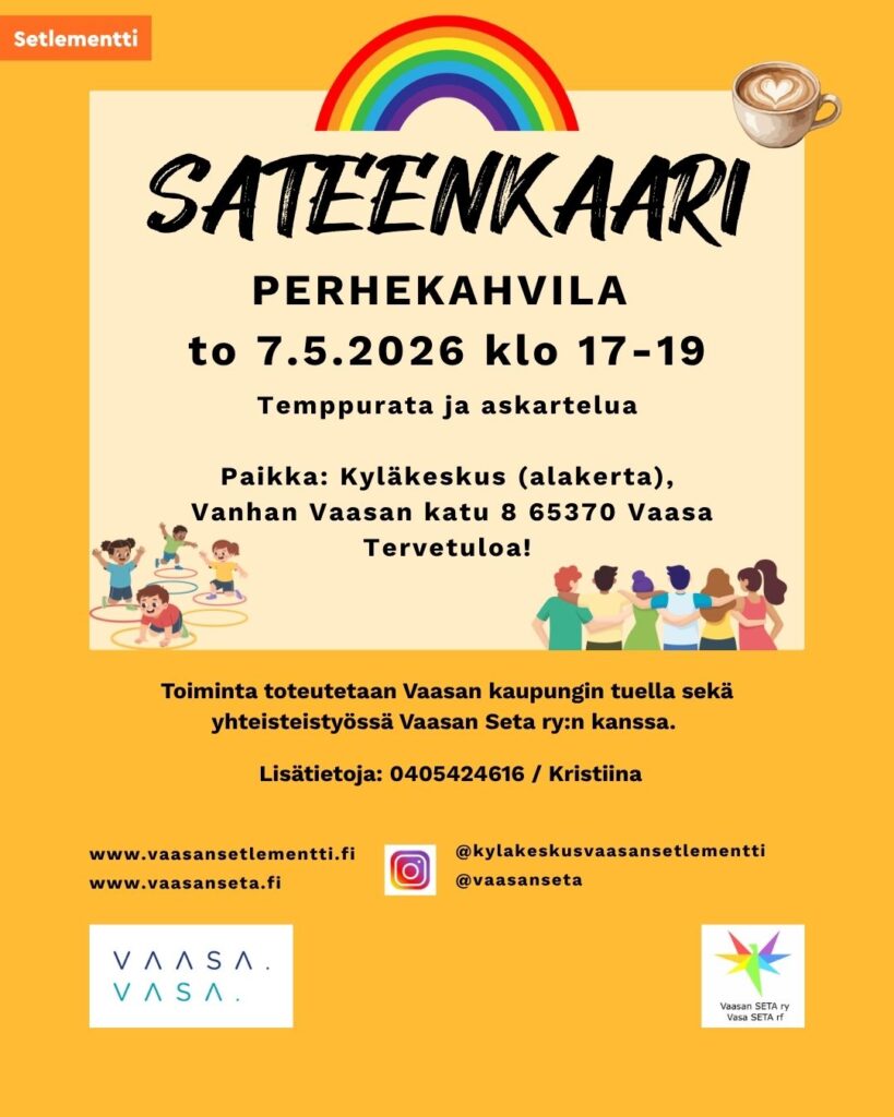 Tulossa: Sateenkaariperhekahvila Kyläkeskuksessa, Vanhan Vaasan katu 8, torstaina 7.5.2026 kello 17-19. Temppurata ja askartelua. Toteutetaan Vaasan kaupungin tuella ja yhteistyössä Vaasan Seta ry:n kanssa. Lisätietoja: 040 542 4616.