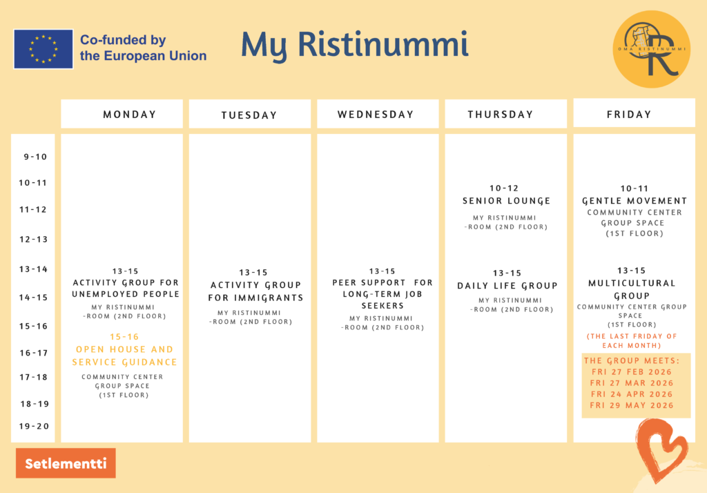 My Ristinummi is an ESF+ (European Social Fund Plus) funded project aimed at promoting and strengthening inclusion, non-discrimination, and the well-being of the local community in the Ristinummi area.