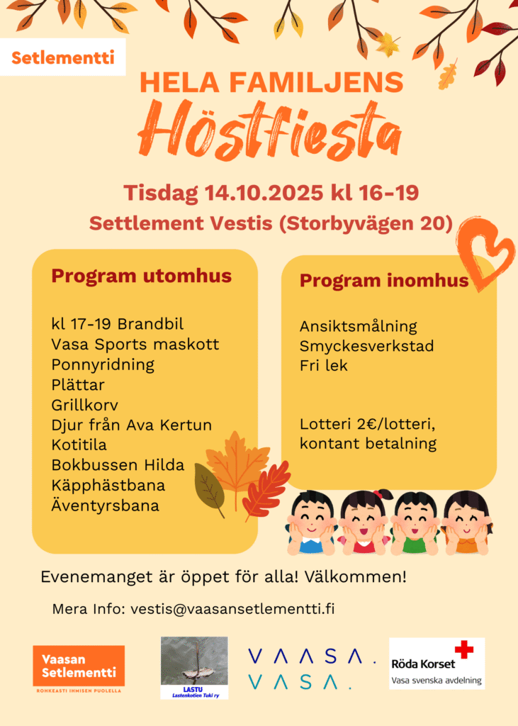 Tisdag 14.10 kl. 16-19 Höstfiesta på Vestis. Program inne och ute.