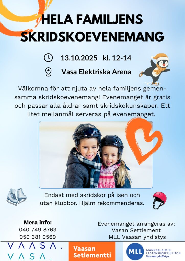 Välkomna och skrinna på höstlovet! Välkomna för att njuta av hela familjens gemensamma sridskoeveneman måndag 13.10 kl. 12-14 till Vasa Elektriska Arena.